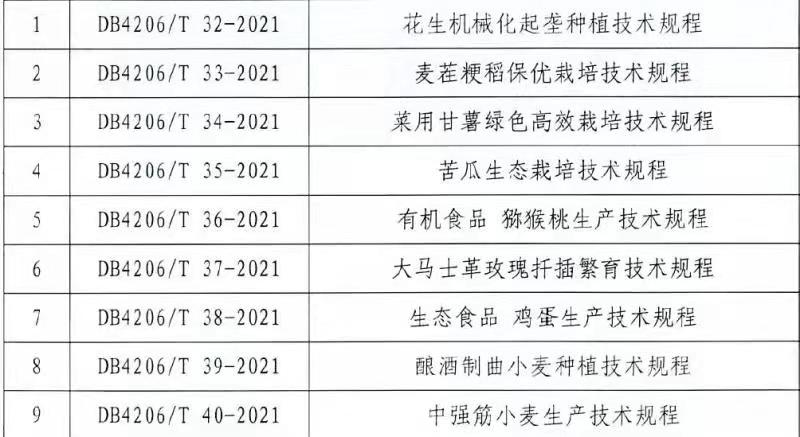 本网( 贾攀)讯 12月13日,由襄阳市农科院制定的《花生机械化起垄种植技术规程》《麦茬粳稻保优栽培技术规程》《菜用甘薯绿色高效栽培技术规程》等9项市级地方标准获得襄阳市市场监督管理局批准发布。