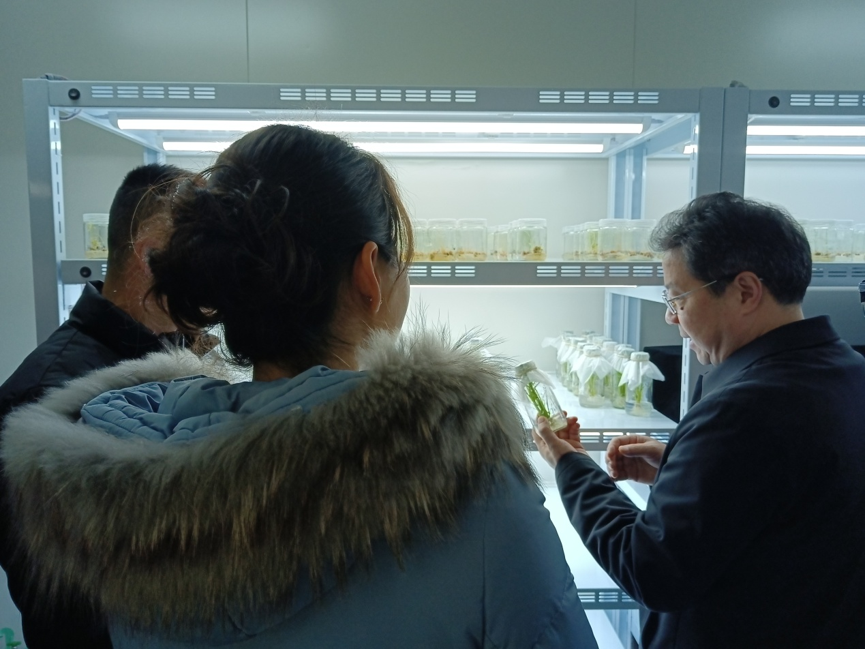 院长冯鹏首先查看了无菌操作间、组培室和人工气候室,听取了水稻团队和生物技术团队负责同志的详细介绍,并与科技人员亲切交谈,针对目前科研工作提出以下几点建议:一是要明确单倍体方法作为一种加速育种手段,必须与其他育种方法有机结合起来,进一步加大中间育种材料的创制;二是要育成好的品种,必须从源头入手,充分挖掘好的种质资源,主动应用智慧农业手段,建立种质资源电子档案;三是要转变思想,充分认识到方法创新、第三方技术评价也是一种科研成果,不要只局限于选育品种;四是要多走出去交流,了解同行处于何种水平,拟定清晰目标,谋划全年亮点。