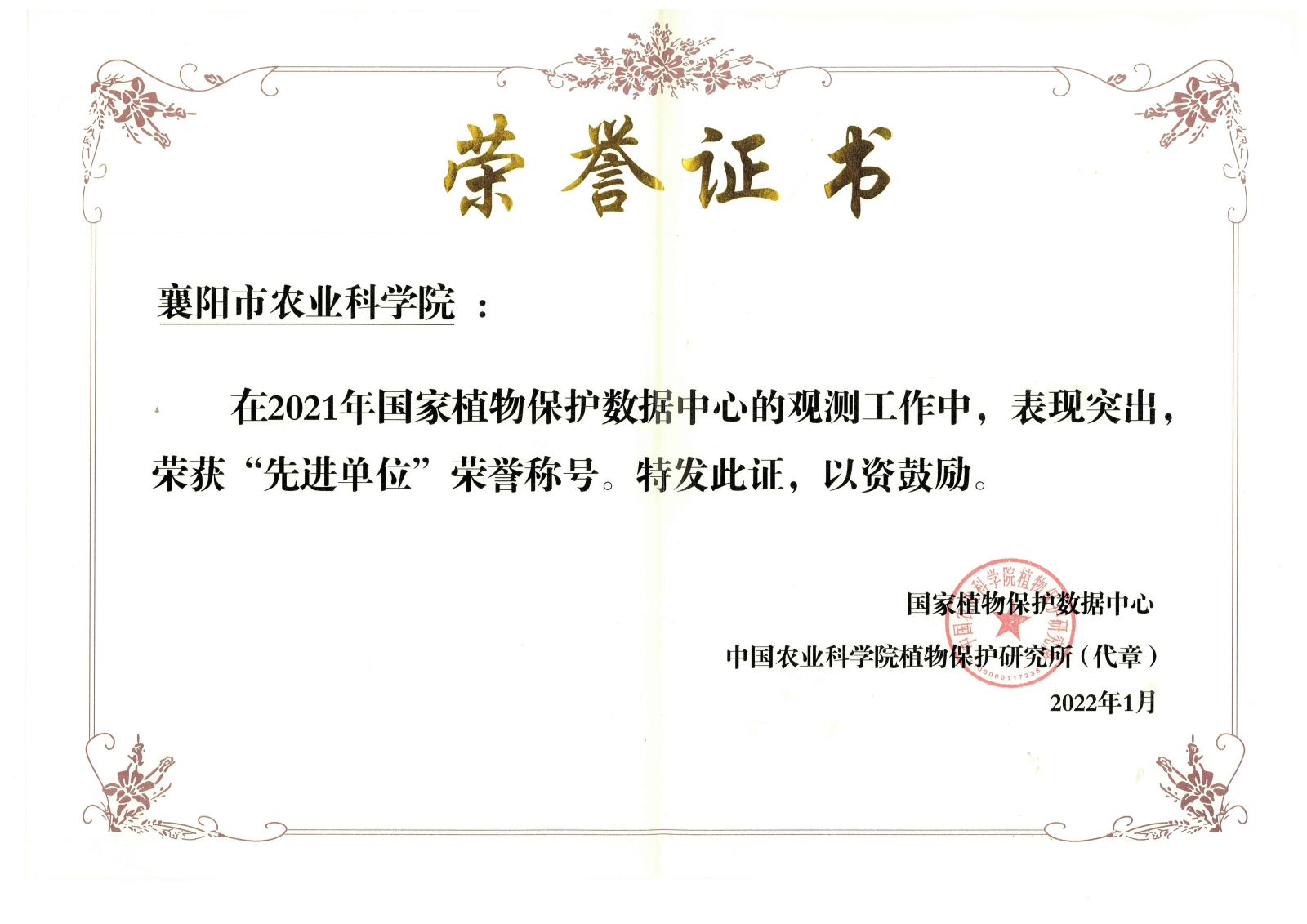 本网(唐清 胡飞)讯 近日,国家植保数据中心授予我院2021年国家植保数据观测“先进单位”荣誉称号,授予我院胡飞、唐清、程一方3名科研人员2021年国家植保数据观测“先进个人”荣誉称号。