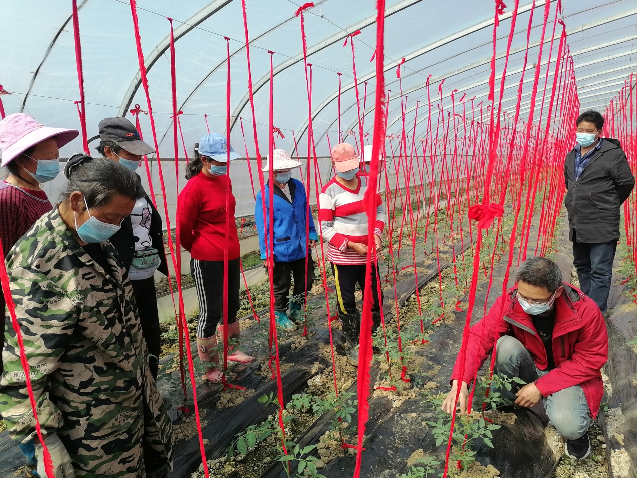 科研人员现场进行了番茄整枝定型、豇豆引蔓上架等实操培训,并就豇豆、辣椒、番茄、茄子等蔬菜的大棚春季温光、水肥、病虫害防治技术进行了现场培训,解答技术疑问20余个,驿寨专业合作社技术人员及周边农户30余人参加了现场培训。
