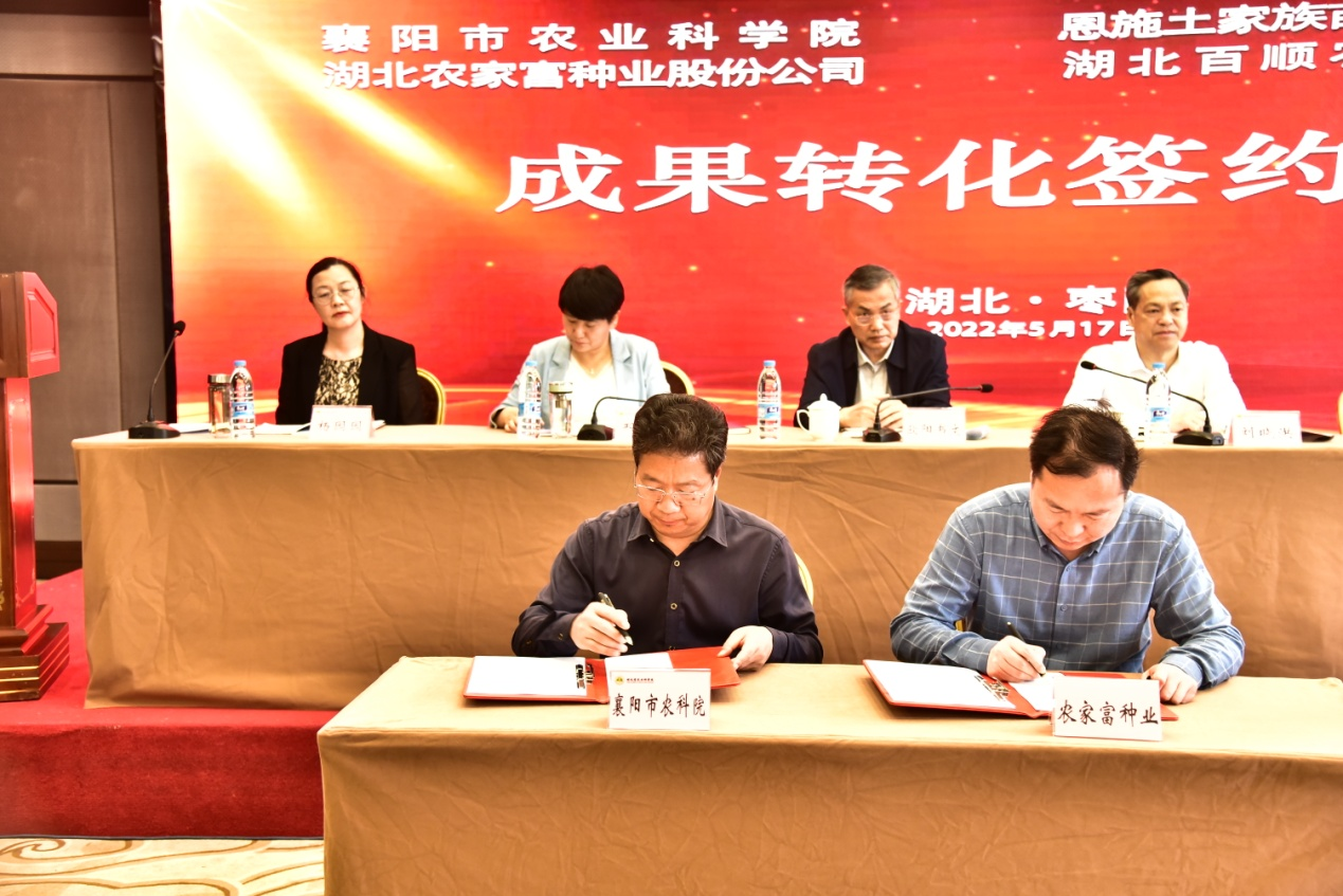在推进会签约仪式现场,我院院长冯鹏与湖北农家富种业股份公司董事长李文东签订了优质小麦品种转让协议,我院以90万元的价格向该公司转让了三项小麦新品种成果。