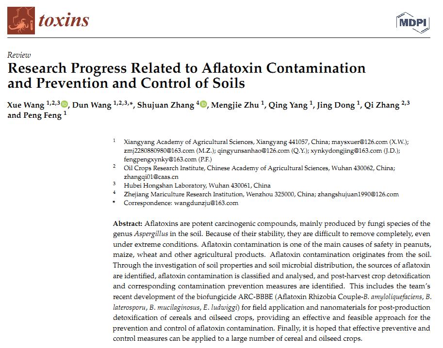 本网(董菁)讯 近日,我院农产品安全团队在土壤黄曲霉毒素污染绿色防控方面的研究成果,以《Research progress related to aflatoxin contamination and prevention and control in soils》为题在国际著名SCI期刊《Toxins》(影响因子4.2)上在线发表。