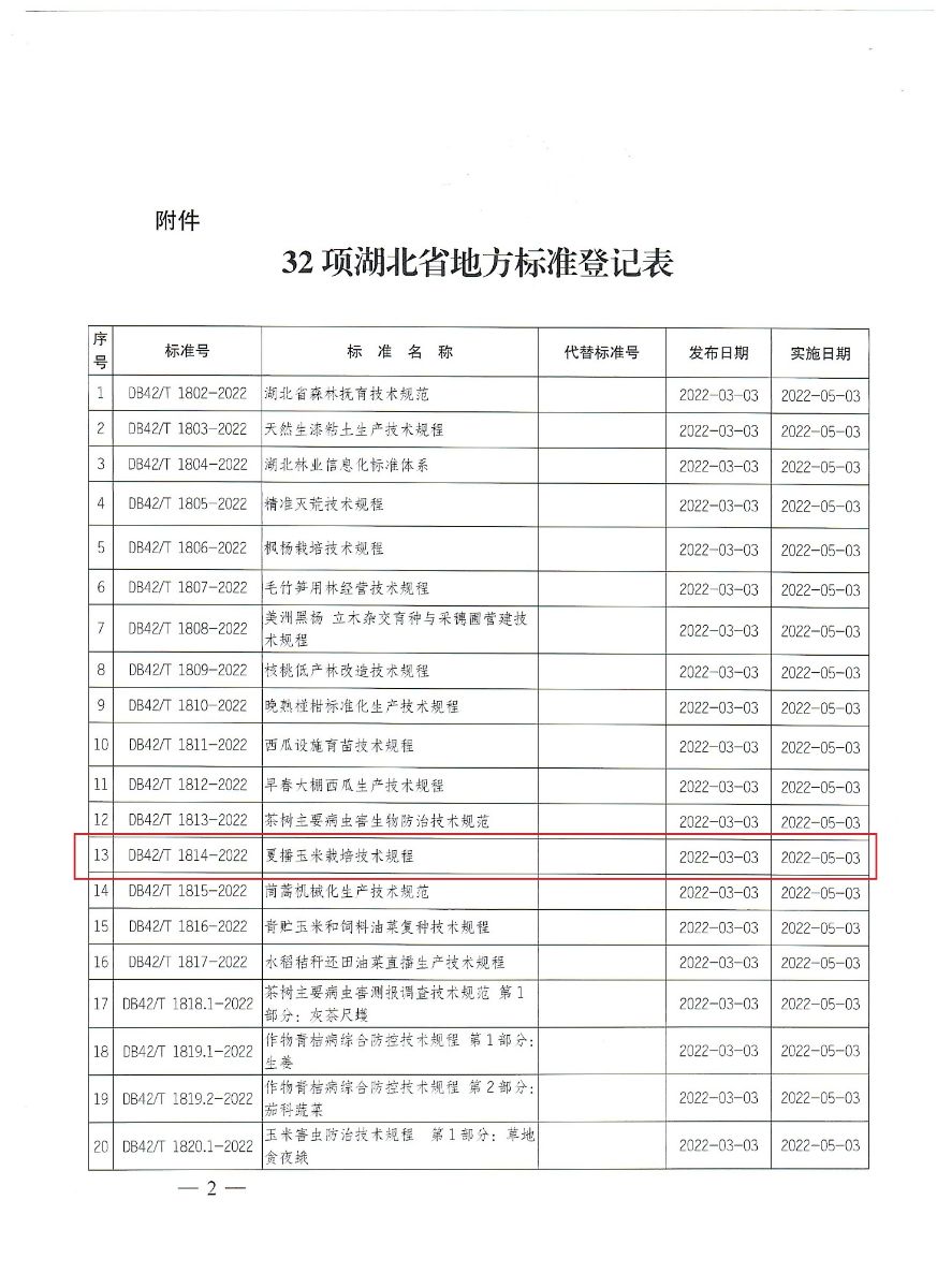 3月3日,由我院制定的湖北省地方标准《夏玉米栽培技术规程》(DB42/T 1814-2022)获得湖北省市场监督管理局批准发布,5月3日起实施。
