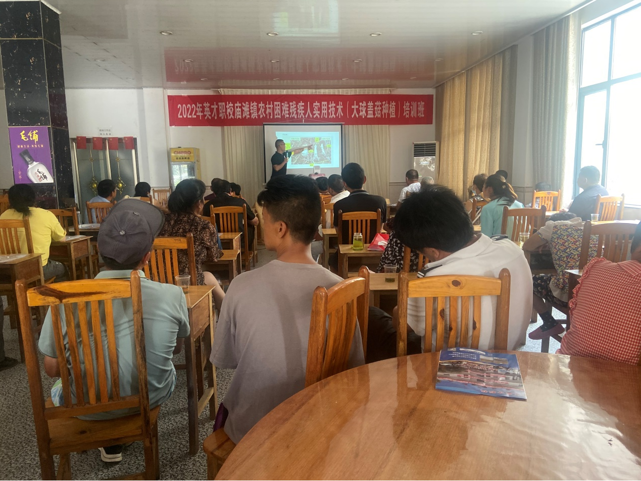 本网(杨青、程旭、陈丹)讯 6月21日-25日,受英才职校校长曾凡成邀请,市农科院农产品加工团队参加了谷城县英才职校开展的庙滩镇、开发区等地农村困难残疾人实用技术(大球盖菇种植)培训,共有80余名学员参加培训。加工中心主任刘兴乐带领团队成员进行大球盖菇栽培技术培训。