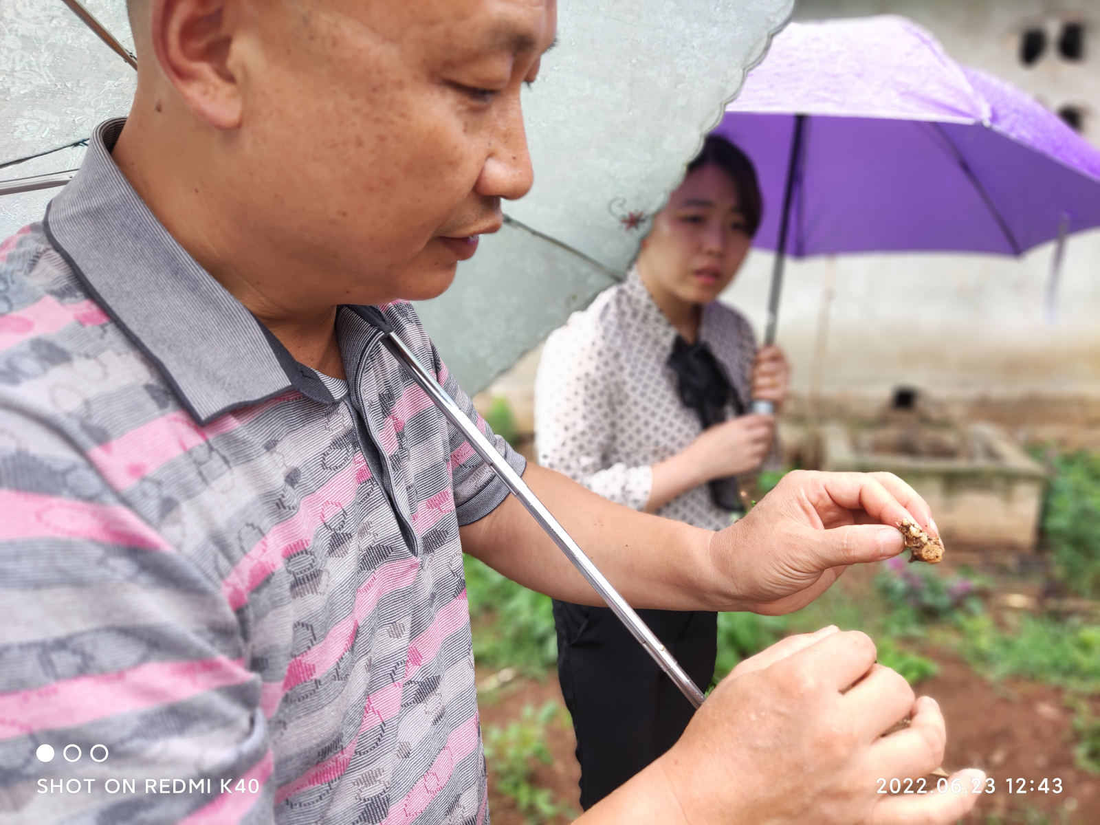 在了解了该村基本发展概况和新建60亩黄精基地种管中遇到的疑惑、困难等情况后,刘克钊一行冒雨实地观察了该基地的地形地貌和测量了海拔高度,现场挖出黄精种苗,仔细查看萌发情况,推测种苗的基源和类型,分析其出苗率极低的主要原因,并给予四点建议:一是黄精为喜肥喜水,喜荫蔽湿润,忌强光、积水的块茎类药材,村技术人员要学习了解其特征特性,加强日常管理;二是要采取人工除草方式,尽快拔除田间杂草,避免草荒夺肥欺苗;三是鉴于基地底肥不足,要视苗情在7-8月,及时追施有机肥+生物菌肥+硫酸钾,混合撒施于行间,用秸秆或树叶等覆盖,避免沟施或穴施伤根;四是赠送该村玉米良种150斤,要求在杂草清除后,趁墒在每条垄边距离种苗30-50cm处,按50cm株距点播一行玉米,为黄精生长遮阴,并经常浇水创造湿润环境。