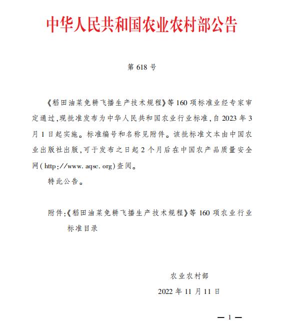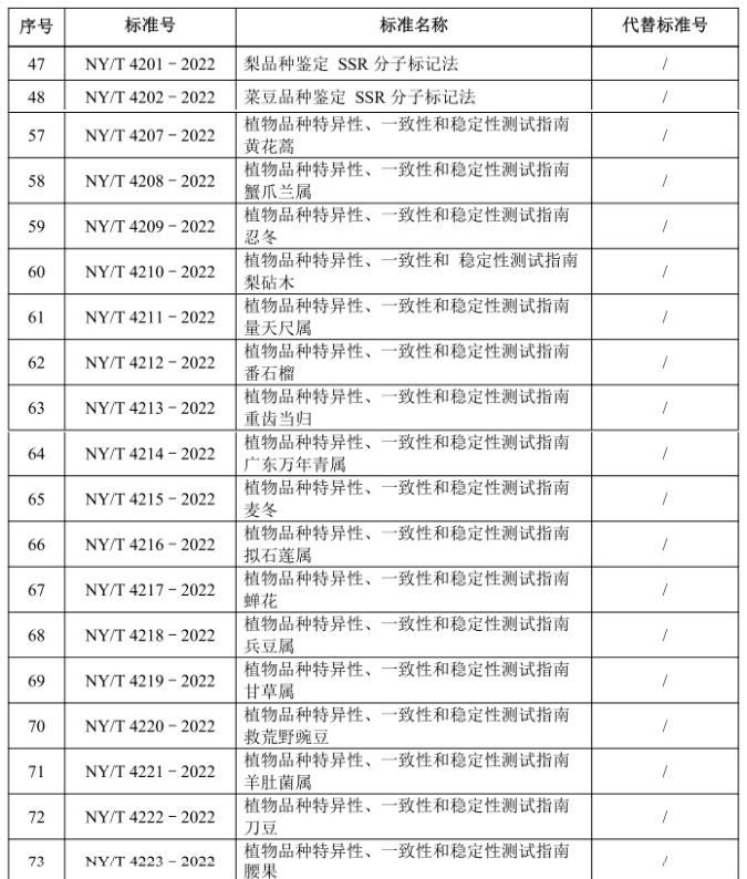 2022年11月11日,农业农村部发布公告,160项标准经专家审定通过,批准发布为中华人民共和国行业标准,自2023年3月1日起实施。其中包括我院牵头制定的《植物品种特异性、一致性和稳定性测试指南 麦冬》等17项DUS测试指南。