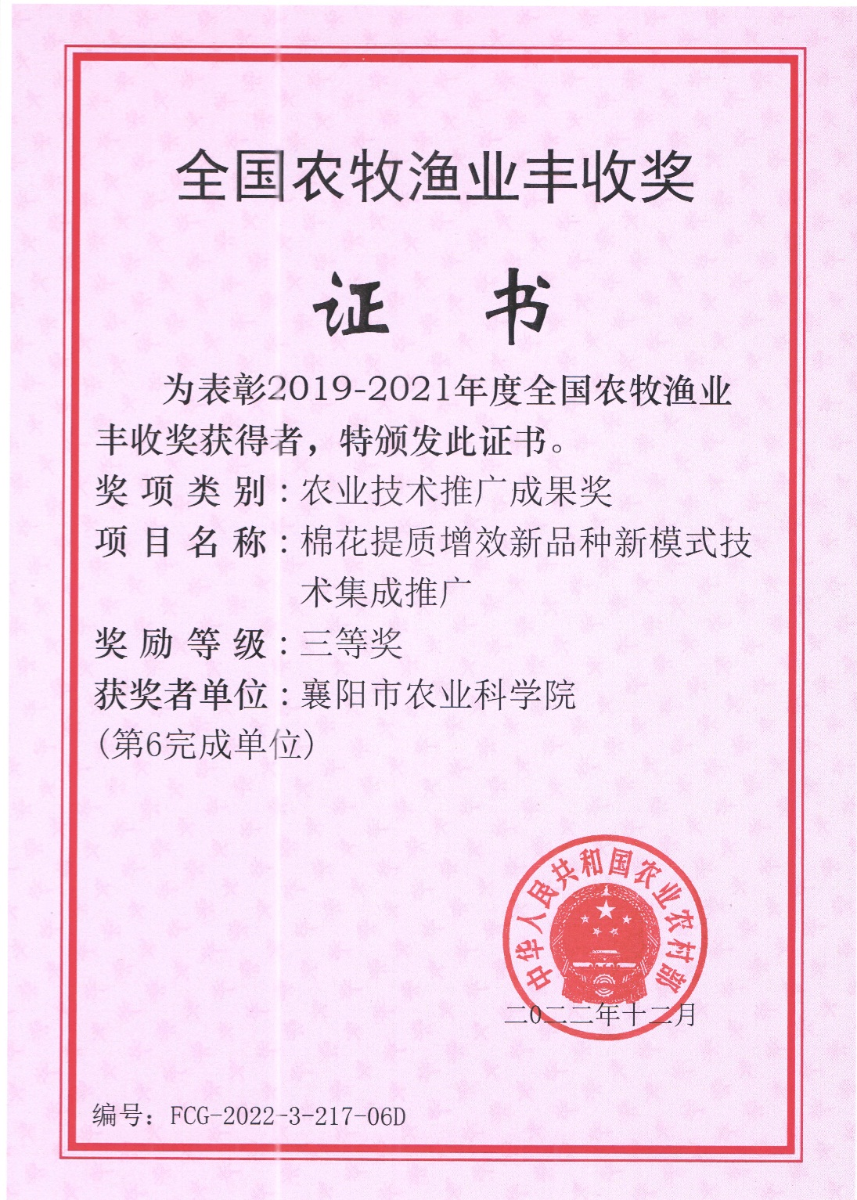 本网(谭永强、袁改改)讯 近日,从农业农村部传来喜讯,我院参与完成的3项科技成果荣获2019-2021年度全国农牧渔业丰收奖,其中:“农业科技‘五个一’行动的实践与创新”项目获农业技术推广合作奖、“茶叶连续化标准化加工技术示范推广”项目获农业技术推广成果奖二等奖、“棉花提质增效新品种新模式技术集成与推广”项目获农业技术推广成果奖三等奖。