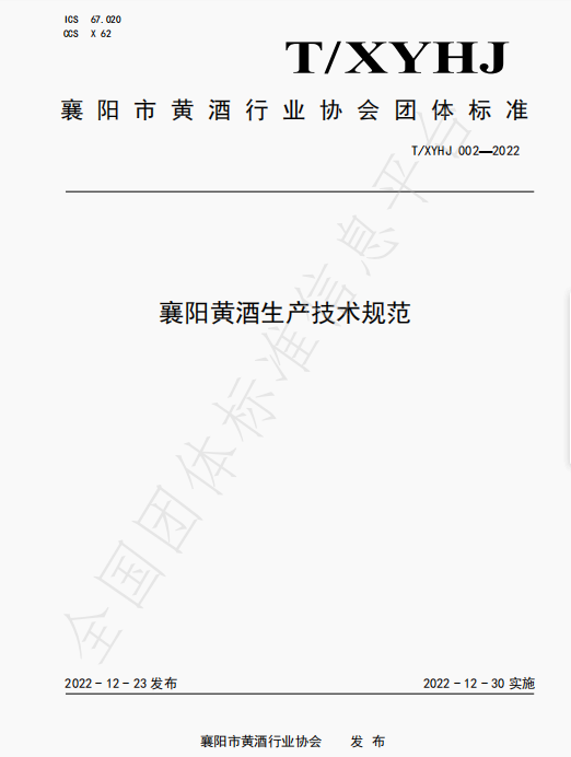 本网(王雪)讯 近日,我院农产品安全团队制定的两项行业标准《襄阳黄酒》(T/XYHJ 001-2022)和《襄阳黄酒生产技术规范》(T/XYHJ 002-2022)在《全国团体标准信息平台》成功发布,于2022年12月30日起实施。