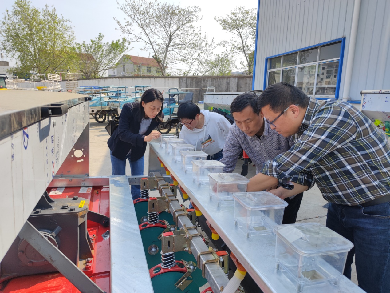 交流会后,特色油料岗位科学家张艳欣研究员带领芝麻团队一同赴鄂州迪拿尔科技有限公司实地考察了芝麻专用精量播种机械,观摩了芝麻精量播种机的开沟、施肥、播种现场,针对鄂北岗地芝麻生产实际对播种机的排种器、开沟器、喷药装置等提出了部分改进意见。