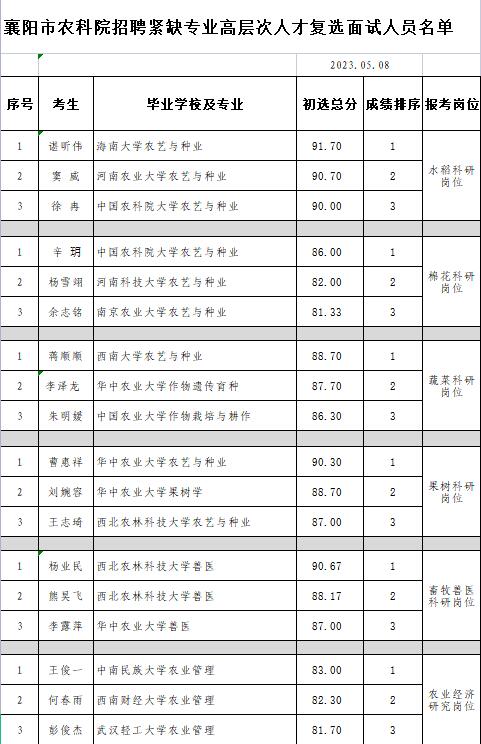按照《市农科院2023年度公开招聘紧缺专业高层次人才工作方案》,经线上初选,按照1:3的比例确定参加复选人员,现将参加复选面试人员名单公告。
