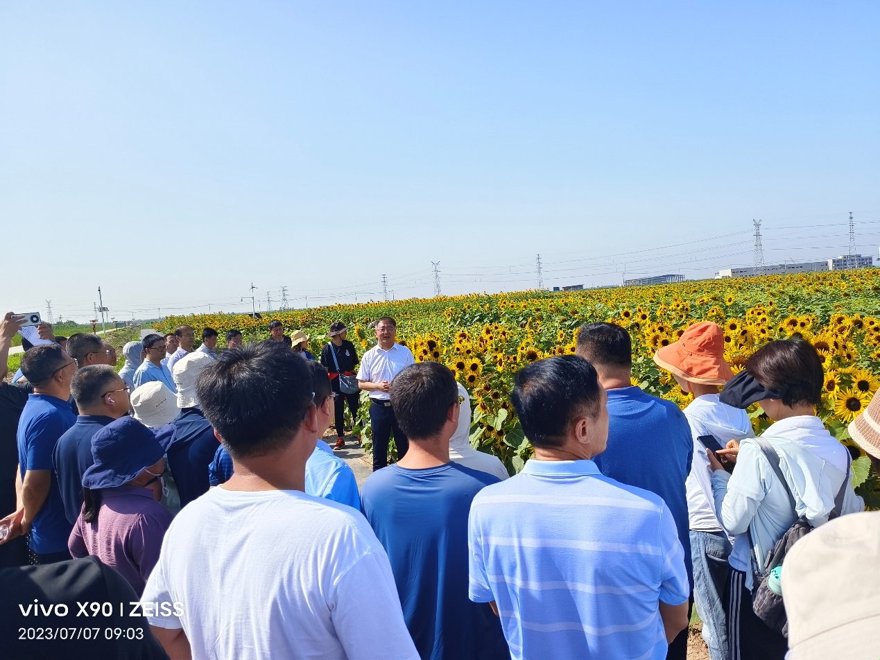 7月6日上午,全国农技推广服务中心品种登记处副处长李荣德详细介绍了国家育种联合攻关意义,要求育种要以产业需求为导向,企业为主体,科研为依托,打造联合育种的“金字塔”阵型。国家特色油料产业技术体系首席科学家张海洋研究员指出了向日葵、芝麻和胡麻生产中的卡脖子问题,要求各岗位和试验站要搭好班子、组建好团队、凝练好目标,发挥各自优势,共同解决问题。随后,向日葵、芝麻、胡麻育种联合攻关首席专家分别就工作进展进行了汇报发言。室内汇报后,与会专家实地考察了昌邑市青阜农业综合体和东营黄河三角洲国家农业科技示范园,分别听取了相关负责人对开展的盐碱地向日葵新品种及配套种植技术试验进展情况汇报。园区内,向日葵长势良好,将成为黄河三角洲盐碱地改良先锋作物,在盐碱地高效利用方面将发挥巨大的作用。