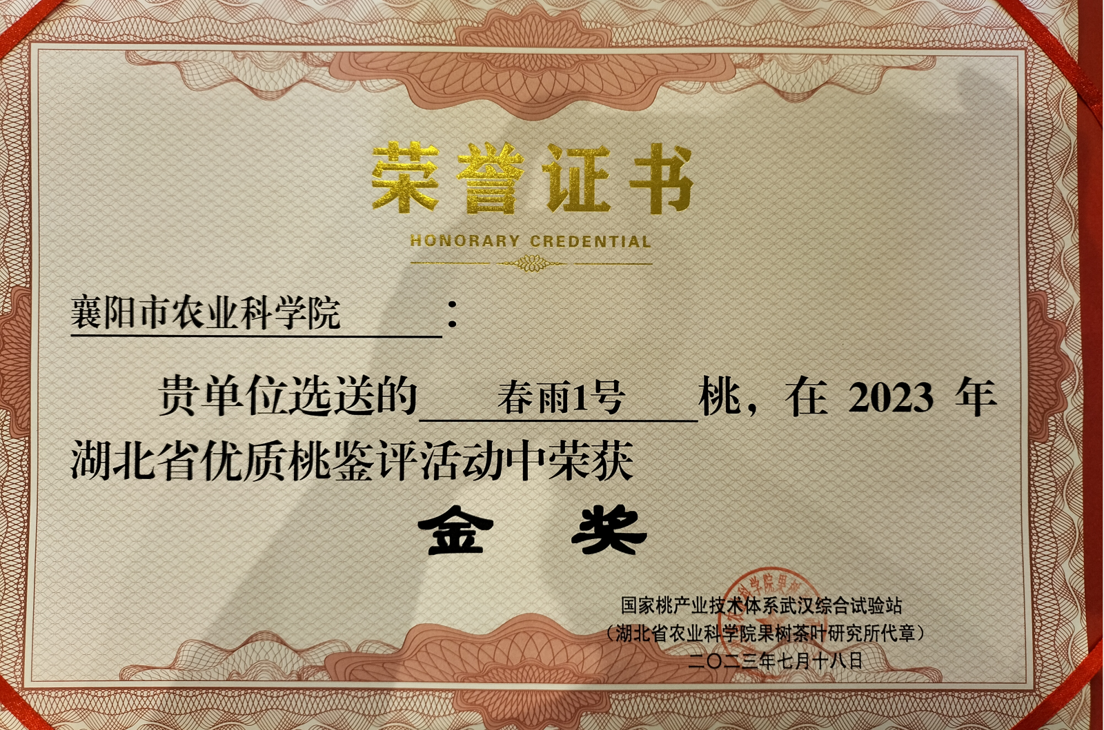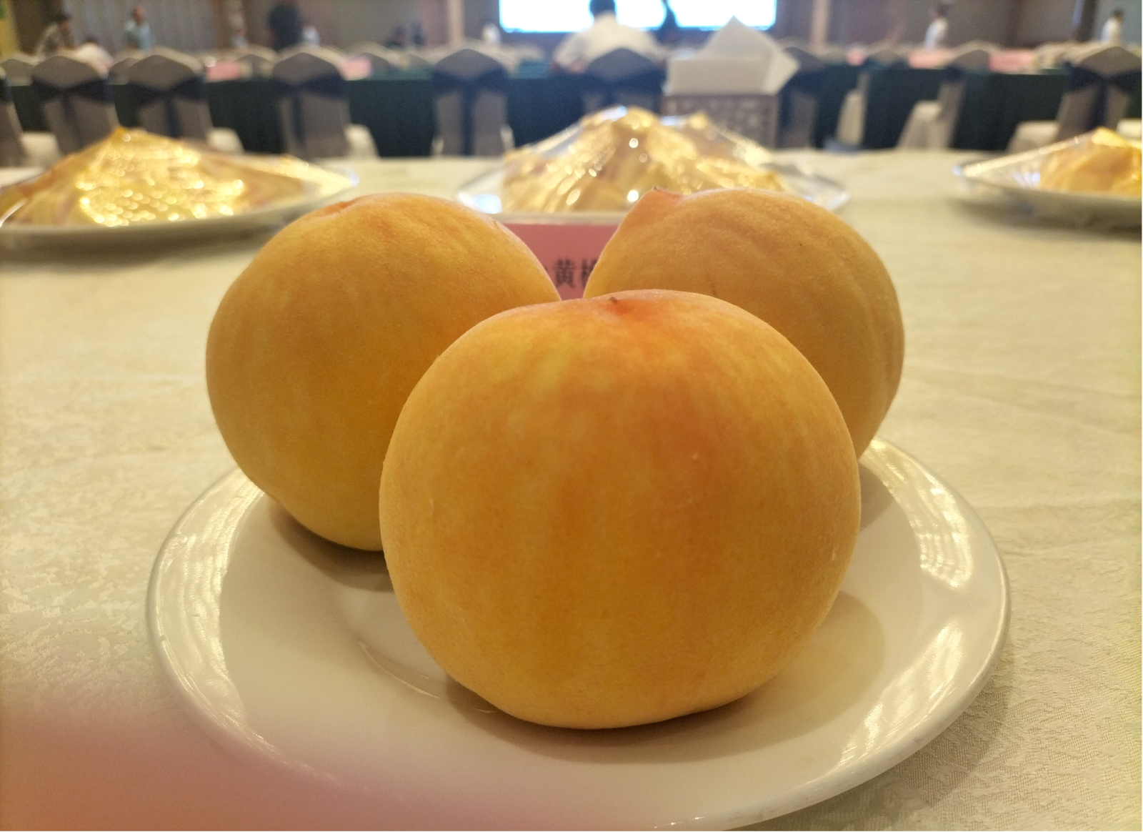 本网(赵广)讯 7月18-19日,湖北省农业农村厅果茶办公室举办的全省精品果园建设现场观摩活动在老河口召开,园艺所果树团队参加观摩会。在湖北省优质桃鉴评环节中,我院选送的“春雨黄桃1号”果个均一、颜色亮黄,风味浓郁,可溶性固形物含量高,在全省104份样品中脱颖而出,荣获金奖。