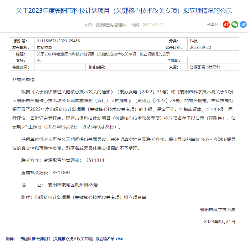 我院申报的1项市级科技计划项目(关键核心技术攻关专项)拟立项