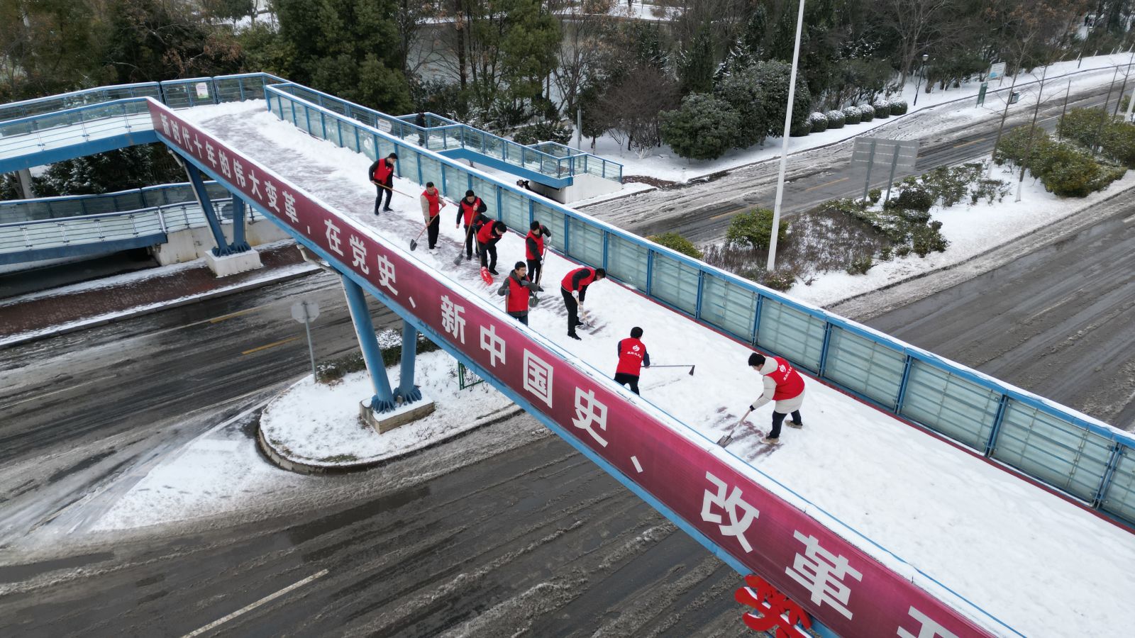 下午,院党委领导班子带领职工干部投身铲雪除冰。分配铲雪工具、细化铲雪任务,在负责清扫院内主干道的同时,还系心于院外群众出行安全,对樊魏路人行天桥开展高强度、高效率的清雪除冰工作,确保周边群众出行安全。